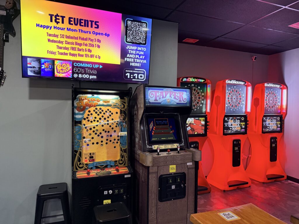 Welcome to t&t trinity arcade bar. we are amanda and paul. 20 yrs of collecting pinball machines, arcade games, dart boards, and driving games, we transformed our living room into the ultimate hangout spot for friends & family.